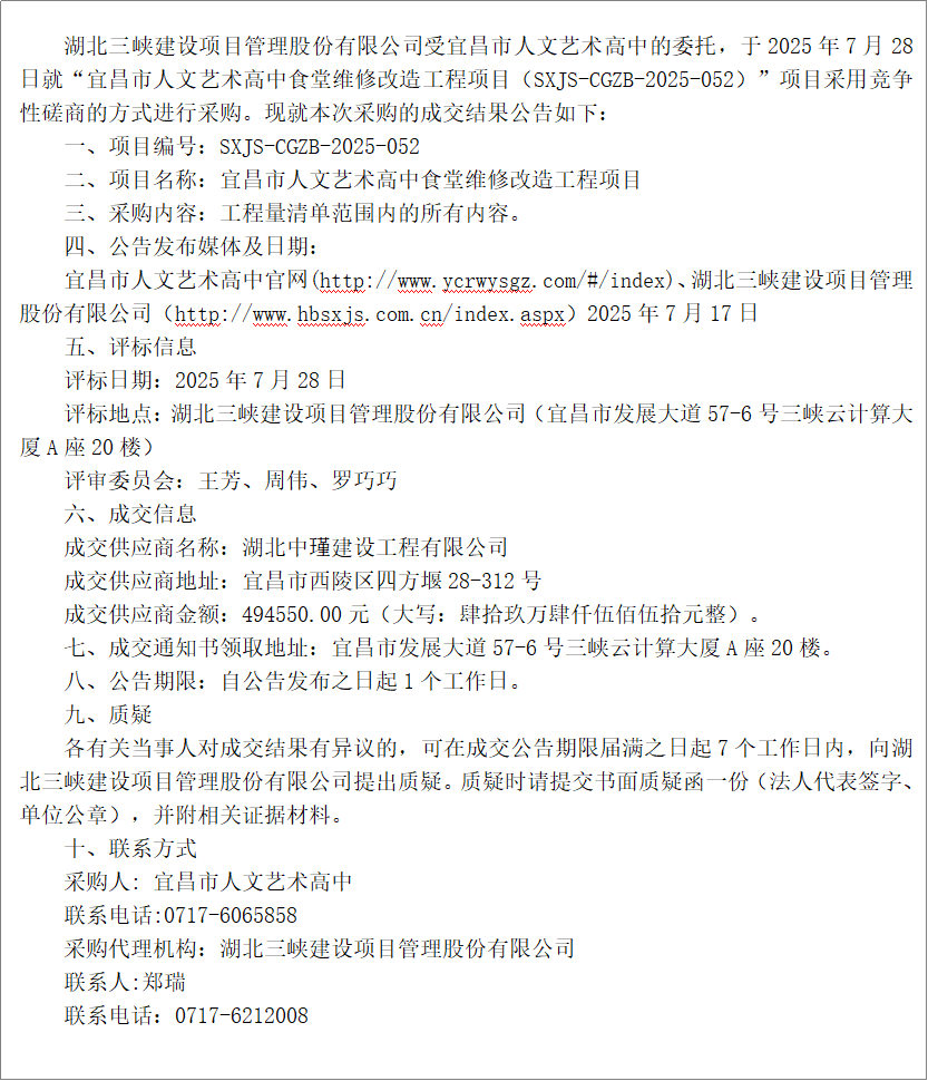 宜昌市人文藝術(shù)高中食堂維修改造工程項(xiàng)目成交結(jié)果公告