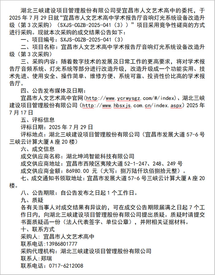 宜昌市人文藝術(shù)高中學(xué)術(shù)報(bào)告廳音響燈光系統(tǒng)設(shè)備改造升級(jí)(第3次采購(gòu))成交結(jié)果公告